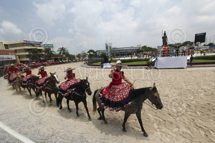 GUADALAJARA, JALISCO 08SEPTIEMBRE2012.- Este medio día en esta ciudad se implanto el Récord Guinness de mayor concentración de Escaramuzas a caballo de diversos grupos, en donde durante un lapso de 12 minutos hicieron suertes charras alrededor de la Glorieta la Minerva, con esto es la primera vez que se implanta el Récord Guinness en esta especialidad y para entregar la certificación estuvo presente la adjudicadora oficial Johanna Hessling. FOTO: FERNANDO CARRANZA GARCÍA /CUARTOSCURO.COM