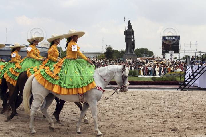 GUADALAJARA, JALISCO 08SEPTIEMBRE2012.- Este medio día en esta ciudad se implanto el Récord Guinness de mayor concentración de Escaramuzas a caballo de diversos grupos, en donde durante un lapso de 12 minutos hicieron suertes charras alrededor de la Glorieta la Minerva, con esto es la primera vez que se implanta el Récord Guinness en esta especialidad y para entregar la certificación estuvo presente la adjudicadora oficial Johanna Hessling. FOTO: FERNANDO CARRANZA GARCÍA /CUARTOSCURO.COM