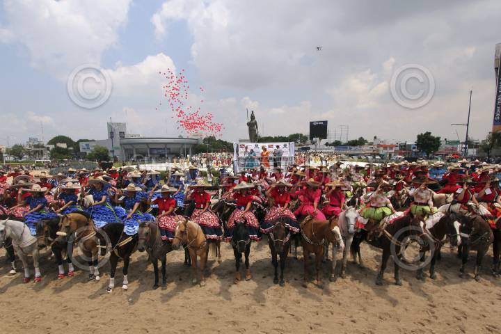 GUADALAJARA, JALISCO 08SEPTIEMBRE2012.- Este medio día en esta ciudad se implanto el Récord Guinness de mayor concentración de Escaramuzas a caballo de diversos grupos, en donde durante un lapso de 12 minutos hicieron suertes charras alrededor de la Glorieta la Minerva, con esto es la primera vez que se implanta el Récord Guinness en esta especialidad y para entregar la certificación estuvo presente la adjudicadora oficial Johanna Hessling. FOTO: FERNANDO CARRANZA GARCÍA /CUARTOSCURO.COM