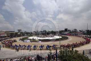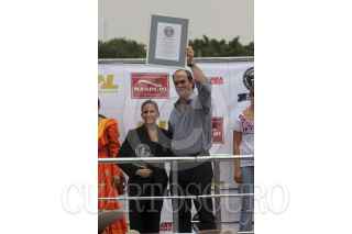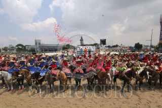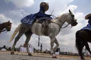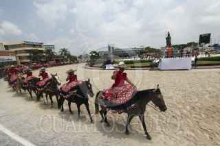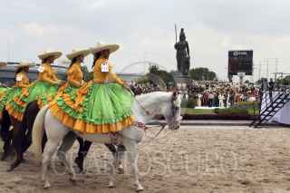 GUADALAJARA, JALISCO 08SEPTIEMBRE2012.- Este medio día en esta ciudad se implanto el Récord Guinness de mayor concentración de Escaramuzas a caballo de diversos grupos, en donde durante un lapso de 12 minutos hicieron suertes charras alrededor de la Glorieta la Minerva, con esto es la primera vez que se implanta el Récord Guinness en esta especialidad y para entregar la certificación estuvo presente la adjudicadora oficial Johanna Hessling. FOTO: FERNANDO CARRANZA GARCÍA /CUARTOSCURO.COM