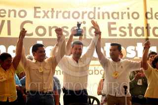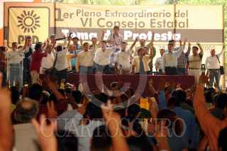 VILLAHERMOSA, TABASCO 28ABRIL2005.- Posterior al acto de toma de protesta del nuevo dirigente Estatal del PRD; militantes y simpatizantes del "Sol Azteca" entonaron el glorioso Imno Nacional y alzando la mano con una "V" de víctoria gritaban te queremos desaforadamente Andrés Manuel López Obrador y Tabasco no te dejara solo. FOTO: Marco Polo Guzmán/CUARTOSCURO.COM
