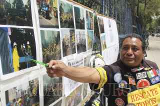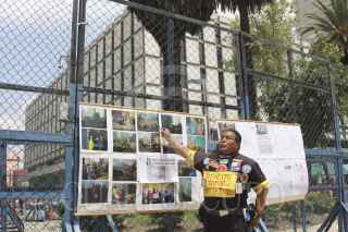 MÉXICO, D.F., 11SEPTIEMBRE2012.- Rafael Rocha Morales, integrantes de los Topos, colocaron un periódico mural con fotografías frente a las instalaciones de la Embajada de Estados Unidos en México, para explicar la participación de los Topos en los actos terroristas del 11 de Septiembre en Nueva York. FOTO: SAÚL LÓPEZ /CUARTOSCURO.COM