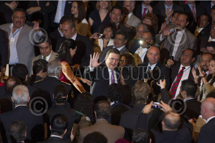 MÉXICO, D.F., 18SEPTIEMBRE2012.- Marcelo Ebrard Casaubón, Jefe de Gobierno, saluda Miguel Ángel Mancera, Jefe de Gobierno Electo, durante la exposición del Sexto de Informe de Gobierno de Ebrard. El perredista afirmó que luego de concluir su gestión se encaminará hacia la contienda electoral del 2018, la cita fue en el Auditorio Nacional. FOTO: MOISÉS PABLO /CUARTOSCURO.COM