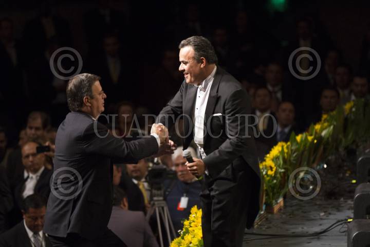 MÉXICO, D.F., 18SEPTIEMBRE2012.- Marcelo Ebrard Casaubón, Jefe de Gobierno, saluda Miguel Ángel Mancera, Jefe de Gobierno Electo, durante la exposición del Sexto de Informe de Gobierno de Ebrard. El perredista afirmó que luego de concluir su gestión se encaminará hacia la contienda electoral del 2018, la cita fue en el Auditorio Nacional. FOTO: MOISÉS PABLO /CUARTOSCURO.COM