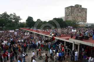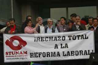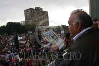 MÉXICO, D.F., 18SEPTIEMBRE2012.- Agustín Rodríguez Fuentes, líder del Sindicato de Trabajadores de la Universidad Nacional Autónoma de México (STUNAM), encabezó un mitin en Rectoria de Ciudad Universitaria, por el rechazo a la iniciativa de reforma laboral propuesta por el Gobierno Federal. FOTO: ADRIANA ALVAREZ /CUARTOSCURO.COM