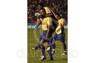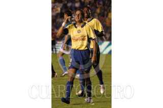 MEXICO, D.F. 30ABRIL2005.- Cuauhtemoc Blanco realizó la segunda anotación de su equipo y festejó con Kléber Boas en en el partido disputado en el estadio azúl donde las águilas del América vencieron 3 goles a 2 a la máquina del Cruz Azul. FOTO: Iván Stephens/CUARTOSCURO.COM