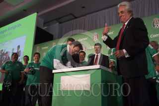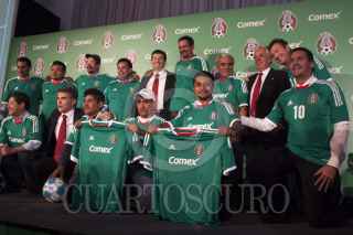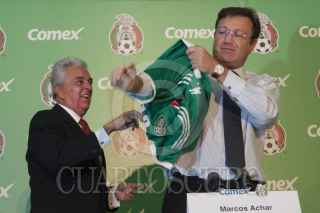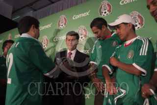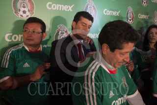 MÉXICO D.F., 20SEPTIEMBRE2012.- José Manuel "Chepo" de la Torre, director técnico de la selección mexicana, firma playeras del tricolor a pintores al finalizar el anunció en donde se dio a conocer que la marca de pinturas Comex vuelve a ser patrocinador oficial de las selecciones de fútbol. FOTO: MOISÉS PABLO /CUARTOSCURO.COM