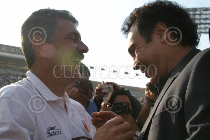 MEXICO, D.F. 01MAYO2005.- Los directores técnicos de los Monarcas del Morelia y el de los Pumasde la UNAM, Rubén Omar Romano y Hugo Sánchez, respectivamente, se saludan al inicio del encuentro de sus partidos. FOTO: Sandra Perdomo/CUARTOSCURO.COM