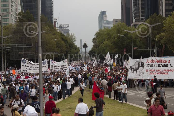 MÉXICO, D.F., 21SEPTIEMBRE2012.- Organizaciones sindicales y sociales como la Unión Nacional de Trabajadores, los sindicatos Mexicano de Electricistas, de Trabajadores de la Universidad Nacional Autónoma de México, de Sobrecargos de Aviación de México, la Alianza de Tranviarios y la Asociación Sindical de Pilotos Aviadores de México, realizaron una marcha partiendo del Angel de la independencia, con destino al Zócalo Capitalino, esto como protesta a la Reforma Laboral promovida por el presidende de la República, Felipe Calderón Hinojosa, pues según plantean viola el artículo 123 de la Constitución. FOTO: PEDRO ANZA /CUARTOSCURO.COM
