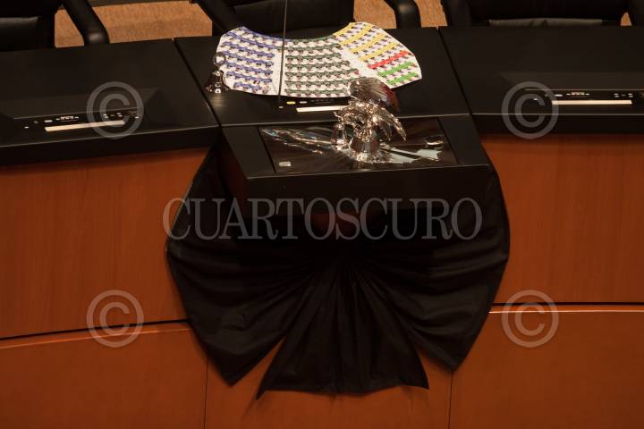 MÉXICO, D.F., 25SEPTIEMBRE2012.- Un moño negro luce en la curul que le perteneciera a Alonso Lujambio, senador del PAN quien murió por la madrugada víctima de cáncer. En la foto se aprecia a sus compañeros de bancada consternados por la perdida. FOTO: MOISÉS PABLO /CUARTOSCURO.COM