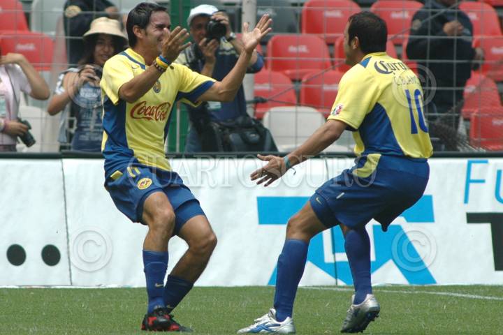 MEXICO, D. F. 08MAYO2005.- Cuauhtemoc Blanco festeja su tercer anotación en el partido disputado contra Atlas donde las Águilas del América se impusieron 5 goles a 2 a los rojinegros del Atlas en el partido de la jornada 17 del torneo de clausura 2005. FOTO: Iván Stephens/CUARTOSCURO.COM