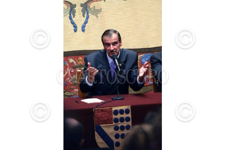 MEXICO, D.F. 09MAYO2005.- Al centro, el presidente Vicente Fox, mientras contestaba algunas preguntas realizadas por miembros de la asociación del IPADE, durante la reunión sostenida en la Universidad Panamericana. FOTO: Sandra Perdomo/CUARTOSCURO.COM