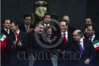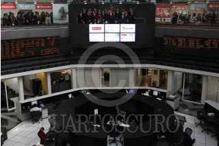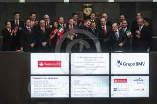 MÉXICO, D.F., 01OCTUBRE2012.- José Antonio Meade, Secretario de Hacienda y Crédito Público junto a Luis Tellez, presidente de la Bolsa Mexicana de Valores y Marcos Martínez Gavica, Presidente Ejecutivo de Grupo Financiero Santander durante la ceremonia de timbrazo del inicio de operaciones en la Bolsa Mexicana de Valores donde se anuncio que Santander México invertirá acciones en la BMV. FOTO: ENRIQUE ORDÓÑEZ /CUARTOSCURO.COM