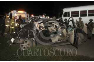 NAVOLATO, SINALOA, 01OCTUBRE2012: Tres muertos y un herido se registró la madrugada de este lunes al chocar militares contra un auto en el que viajaban presuntos gatilleros. De acuerdo a los datos recabados en el lugar del accidente, señalan que poco después de las 0:30 horas de este lunes, un convoy de militares que realizaban revisiones en el poblado de Villamoros, observaron dos unidades motrices que aproximaban al operativo y ver que se trataba de militares, dieron vuelta para darse a la fuga. Los militares iniciaron la persecución y al no detenerse los gatilleros perdieron el control de la unidad en la que viajaban para terminar chocando contra un camión de jornaleros. En el vehículo fueron encontrados dos fusiles AR-15, una subametralladora marca Ingram, calibre 9mm y una pistola escuadra calibre .45, así como de equipo táctico y cargadores para armas de fuego. FOTO: ESPECIAL /CUARTOSCURO.COM