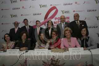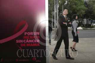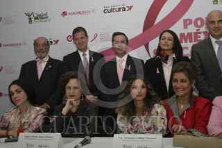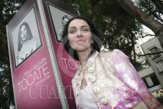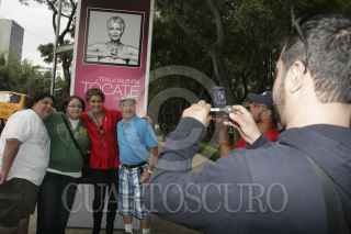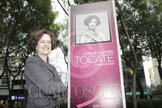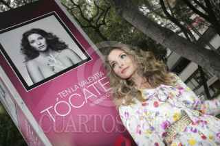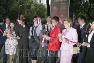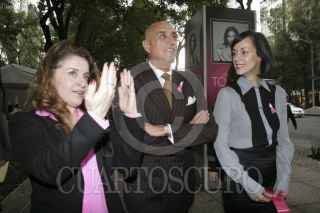 MÉXICO, D.F., 01OCTUBRE2012.-Daniela Romo posa con admiradores frente a la foto que le realizó Pedro Torres, productor y fotógrafo de la exposición " Tocate", dentro de la campaña "Por un México sin cáncer de mama". Esta exposición se muestran fotos de diversas celebridades femeninas con el torso para ser retratadas y expuestas en paseo de la Reforma. FOTO: JUAN PABLO ZAMORA /CUARTOSCURO.COM