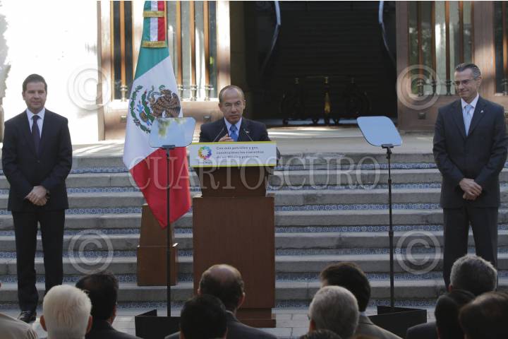MÉXICO, D.F., 05OCTUBRE2012.- Felipe Calderón Hinojosa, Presidente de México, y Juan José Suárez Coppel, director de Pemex, anunciaron el descubrimiento de una nueva reserva descubierta con la perforación del pozo Supremus-1, con este hallazgo se incorporará reservas por hasta 125 millones de barriles de petróleo crudo equivalente (mmbpce), con recursos potenciales hasta por 447 mbpce. FOTO: MOISÉS PABLO /CUARTOSCURO.COM