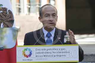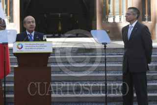 MÉXICO, D.F., 05OCTUBRE2012.- Felipe Calderón Hinojosa, Presidente de México, y Juan José Suárez Coppel, director de Pemex, anunciaron el descubrimiento de una nueva reserva descubierta con la perforación del pozo Supremus-1, con este hallazgo se incorporará reservas por hasta 125 millones de barriles de petróleo crudo equivalente (mmbpce), con recursos potenciales hasta por 447 mbpce. FOTO: MOISÉS PABLO /CUARTOSCURO.COM