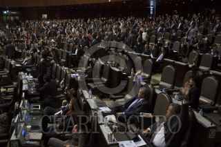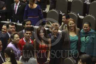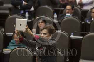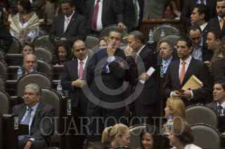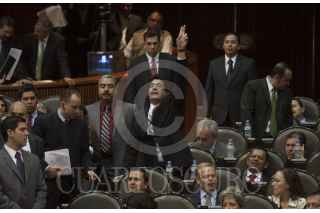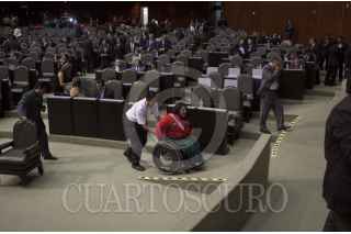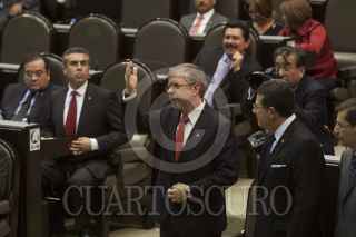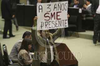MÉXICO, D.F., 11OCTUBRE2012.- José Luis Muñoz Soria, diputado federal del PRD, mostró una pancarta recordando los 3 años que por decreto del Poder Ejecutivo se extinguió a la Compañía de de Luz y Fuerza del Centro, esto fue durante la sesión en la Cámara de Diputados. FOTO: MOISÉS PABLO /CUARTOSCURO.COM