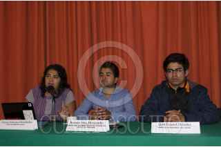 MÉXICO, D.F., 11OCTUBRE2012.- Tania Paloma Hernandéz, vocera del Foro Academica UACM, Ramón Islas Hernandéz, vocero de los consejeros universitarios en defensa del voto y la legalidad, y Aldo Daniel Méndez del Consejo Estudiantil de Lucha dieron está mañana una conferencia en el Centro Nacional de Comunicación Social CENCOS para informar sobre la violación al proceso electoral del Tercer Consejo Universitario, este hecho hace que se retrase la solución al conflicto, por lo que en la tarde habra otra mesa de diálogo en donde estara la Comisión Mixta. FOTO: SANDRA PÉREZ /CUARTOSCURO.COM