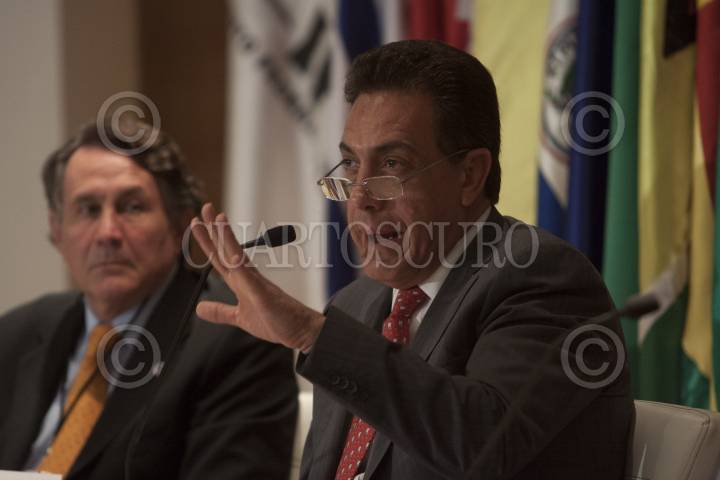 MÉXICO, D.F., 12OCTUBRE2012.- Omar Fayad, presidente de la Comisión de Seguridad Pública del Senado, y Miguel Ángel Mancera, Jefe de Gobierno electo, durante su participación en la mesa "narcotráfico, violencia y política: ¿cuáles son las estrategias concretas para enfrentar el poder del crimen organizado?, que se realizó en el Colegio de México, en el marco del III Foro de la Democracia Latinoamericana. FOTO: MOISÉS PABLO /CUARTOSCURO.COM