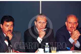En medio de los diputados Juan Manuel Bernal y Jesús Orozco, el secretario de Comunicaciones y Transportes, Pedro Cerisola, escucha las preguntas que los legisladores le plantearon durante su comparecencia. "La construcción del aeropuerto alterno en la ciudad de México ya no es urgente", aseguró el secretario. FOTO: Oswaldo Ramírez/CUARTOSCURO.COM