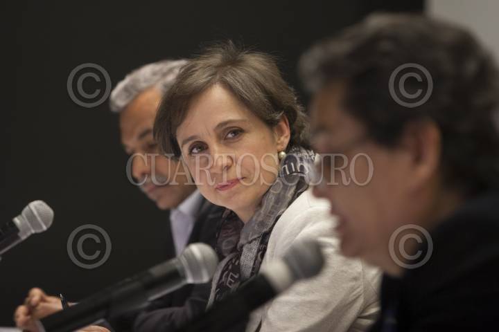 MÉXICO, D.F. 16OCTUBRE2012.- El escritor y periodista, Tomás Segovia, Carlos Díaz, Carmen Aristegui, José Reveles y Tomás Granados hijo del fallecido periodista, Miguel A. Granados Chapa, presentaron el libro de su padre "Manuel Buendía, el primer asesinato de la narcopolitica mexicana" que casi lo termina y su hijo retomó para detallar, la noche de hoy en la libreria Rosario Castellanos ante un auditorio abarrotado. FOTO: FRANCISCO RODRÏGUEZ /CUARTOSCURO.COM