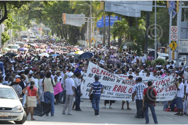 ACAPULCO, GUERRERO 16OCTUBRE2012.- Más de 3800 personas protestaron en la sede de la Policía Federal en Acapulco, contra "los abusos de elementos federales", a los que acusaron de excederse en sus funciones mediante detenciones arbitrarias y tortura de personas inocentes a quienes les plantan armas y drogas. La manifestación se dirigió primero al centro comercial Costera 125, y posteriormente marcharon hacia el zócalo, en el centro de la ciudad, bloqueando ambos sentidos de la Costera Miguel Alemán por casi 3 horas. FOTO: BERNANDINO HERNÁNDEZ /CUARTOSCURO.COM