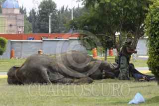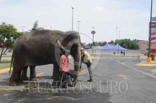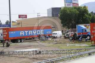COACALCO, ESTADO DE MÉXICO, 15OCTUBRE2012.- Animales del Circo Atayde Hermanos del municipio de Coacalco tuvieron que ser evacuados y asegurados en un el estacionamiento de uno de los comercios aledaños debido a una fuga en un ducto de gar natural de 8 Pulgadas que fue perforado al momento de colocar la carpa de dicho circo. FOTO: LUIS CARABAYO /CUARTOSCURO.COM
