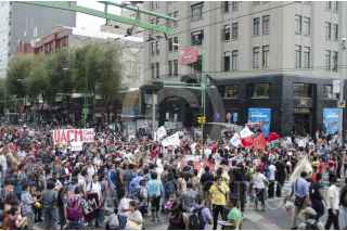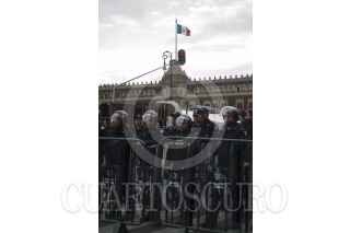 MÉXICO, D.F., 18OCTUBRE2012.- Estudiantes y maestros de la Universidad Autónoma de la Ciudad de México realizaron una marcha de la sede de la secretaría de Educación del DF al Zócalo. La movilización se da luego de que el día ayer se anunciaron avences en las negociaciones para destrabar el conflicto estudiantil, sin embargo, la instalación del Tercer Consejo Universitario aún so se ha dado, siendo una de las principales demandad para una solución. Aunque se hablaba de que el próximo lunes se podrían entregar los planteles, los uacemitas en huelga negaron este hecho, ya que señalan que la rectora María Esther Orozco es la principal opositora a reconocer a algunos de los integrantes de este consejo universitario. A la llegada de los manifestantes al Zócalo se encontraron rodeado de policias federales porque en esos momentos se llevaba acabo un evento del Presidente. FOTO: SANDRA PÉREZ /CUARTOSCURO.COM