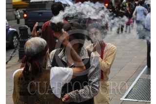 MÉXICO, D.F., 19OCTUBRE2012.- Un curandero realiza una "limpia" con ayuda de hierbas e incienso para alejar las malas vibras, mientras una mujer observa de manera desorbitada dicho ritual. Encuestas realizadas por el INEGI y el Conacyt revelan que los mexicanos reconocen que confían demasiado en la fe y muy poco en la ciencia. FOTO: DIEGO SIMÓN SÁNCHEZ /CUARTOSCURO.COM