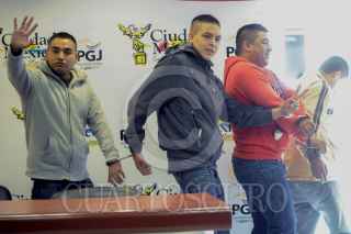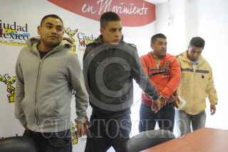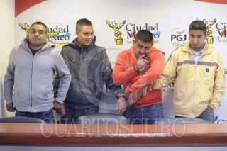 MÉXICO, D.F., 21OCTUBRE2012.- Héctor Villafán Osorio, Carlos Raúl Villafán Ríos, José Francisco Cazares Contreras y Ricardo Iván Flores Solozábal, fueron presentados a los medios de comunicación en las instalaciones de la PGJDF por su presunta responsabilidad como distribuidores de drogas en la colonia Morelos. FOTO: LUIS CRABAYO /CUARTOSCURO.COM