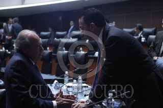 MÉXICO, D.F., 23OCTUBRE2012.- Carlos Romero Deschamps, senador del PRI y Mónica Arreola, senadora de Nueva Alianza, durante los cabildeos de la Reforma Laboral, en el Senado de la República. La minuta fue aprobada con 110 votos a favor y 28 en contra. FOTO: IVÁN MENDEZ /CUARTOSCURO.COM