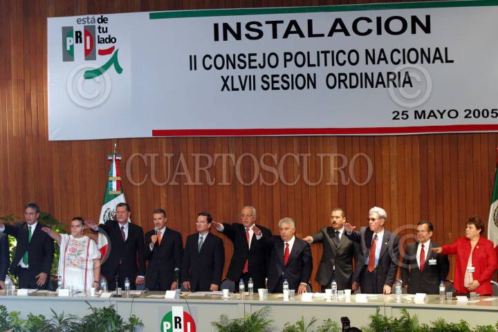 MEXICO, D.F., 25MAYO2005.- Arturo Montiel, gobernador del Estado de México, Enrique Peña Nieto, candidato a la gubernatura del Estado de México y Roberto Madrazo, líder nacional del PRI, durante la instalación del II Consejo Político Nacional, XLVII Sesión Ordinaria, en la ceremonia tomaron protesta los nuevos integrantes del consejo político. FOTO: Moisés Pablo/CUARTOSCURO.COM