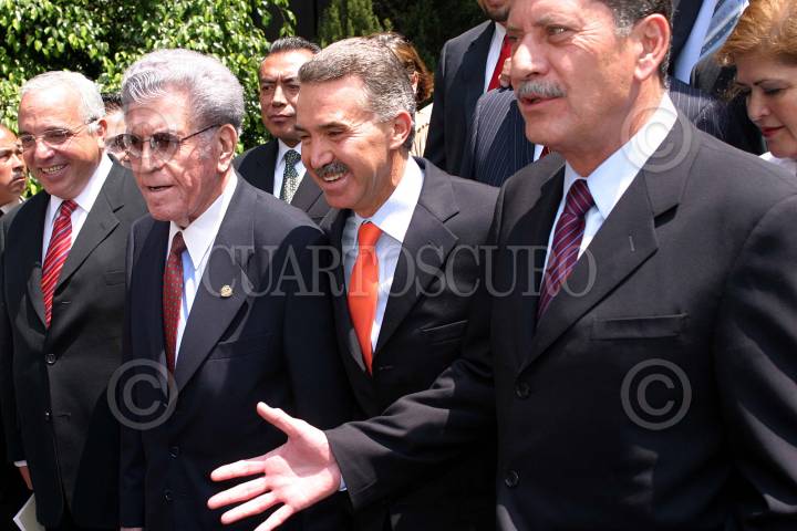 MEXICO, D.F., 25MAYO2005.- Arturo Montiel, gobernador del Estado de México, Enrique Peña Nieto, candidato a la gubernatura del Estado de México y Roberto Madrazo, líder nacional del PRI, durante la instalación del II Consejo Político Nacional, XLVII Sesión Ordinaria, en la ceremonia tomaron protesta los nuevos integrantes del consejo político. FOTO: Moisés Pablo/CUARTOSCURO.COM