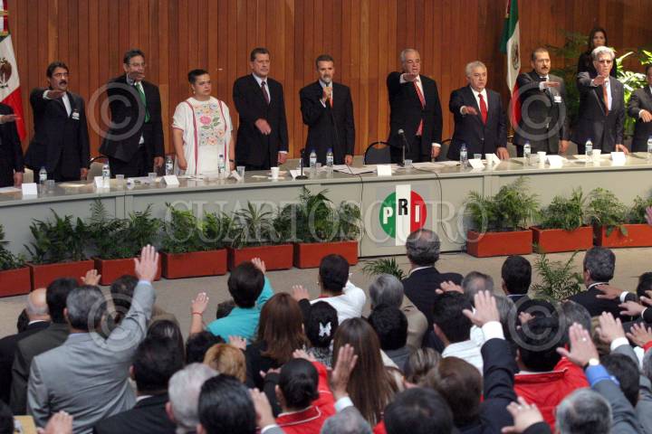 MEXICO, D.F., 25MAYO2005.- Arturo Montiel, gobernador del Estado de México, Enrique Peña Nieto, candidato a la gubernatura del Estado de México y Roberto Madrazo, líder nacional del PRI, durante la instalación del II Consejo Político Nacional, XLVII Sesión Ordinaria, en la ceremonia tomaron protesta los nuevos integrantes del consejo político. FOTO: Moisés Pablo/CUARTOSCURO.COM