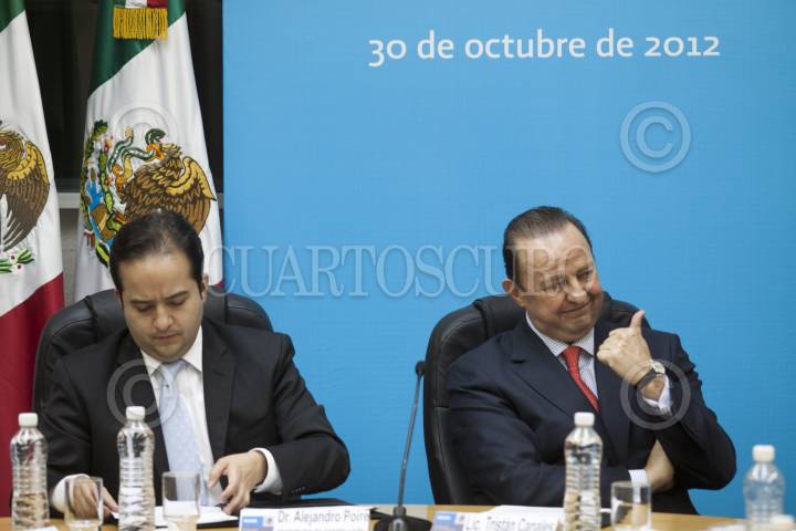 MÉXICO, D.F. 30OCTURBRE2012.- Rogerio Azcarraga, presidente del Consejo de Administración de Grupo Fórmula, conversa con Alejandro Poiré, secretario de Gobernación, al finalizar la firma de un convenio para concertar acciones en la implementación del mecanismo para la protección de periodistas y defensores de derechos humanos. FOTO: MOISÉS PABLO /CUARTOSCURO.COM