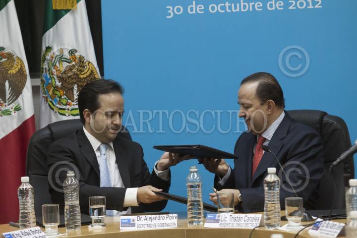 MÉXICO, D.F. 30OCTURBRE2012.- Rogerio Azcarraga, presidente del Consejo de Administración de Grupo Fórmula, conversa con Alejandro Poiré, secretario de Gobernación, al finalizar la firma de un convenio para concertar acciones en la implementación del mecanismo para la protección de periodistas y defensores de derechos humanos. FOTO: MOISÉS PABLO /CUARTOSCURO.COM