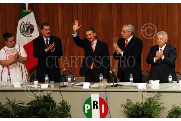 MEXICO, D.F., 25MAYO2005.- Arturo Montiel, gobernador del Estado de México, Enrique Peña Nieto, candidato a la gubernatura del Estado de México y Roberto Madrazo, líder nacional del PRI, durante la instalación del II Consejo Político Nacional, XLVII Sesión Ordinaria, en la ceremonia tomaron protesta los nuevos integrantes del consejo político. FOTO: Moisés Pablo/CUARTOSCURO.COM