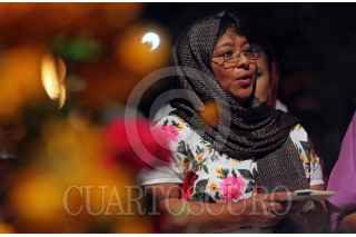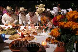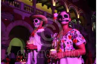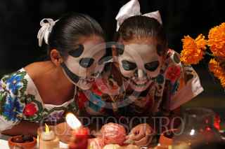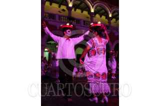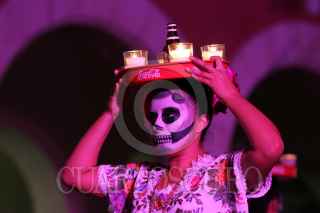 MERIDA, YUCATAN 30OCTUBRE2012.- “El baile de las ánimas” es un evento que se realiza en vísperas del día de muertos en la Entidad. En el espectáculo se ofrece una semblanza de las tradiciones del día de muertos en el Mayab; los bailes, los trajes típicos y las ofrendas. Los participantes vestidos con ropa típica de la región en este caso las mujeres con huipil y los hombres con guayabera y pantalón de manta, ambos con el rostro pintado de calaveras; realizan oraciones a las ánimas acompañados con música de una “serafina”, instrumento que hace años solía estar en las novenas yucatecas. Incienso, bailes regionales, flores, juegos y un gran altar adornan el ambiente para llevar acabo la representación de las ánimas y de esta manera dar la bienvenida a los fieles difuntos.. FOTO: FRANCISCO BALDERAS /CUARTOSCURO.COM