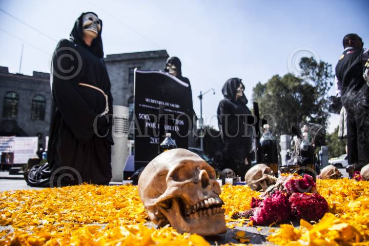 MÉXICO, D.F., 31OCTUBRE2012.-Ofrenda de muertos en protesta por el más de medio millón de muertos por diabetes por parte de asociación civil el Poder del Consumidor en contra del Presidente de la República Felipe Calderón Hinojosa en la Secretaría de Salud. FOTO: CHRISTIANN DAVIS /CUARTOSCURO.COM