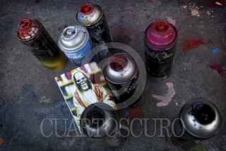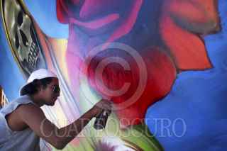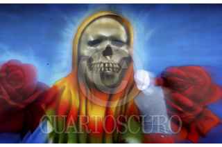 VERACRUZ, VERACRUZ, 31OCTUBRE2012.- Un joven graffitero apodado "Roos" pinta la imagen de la Santa Muerte en la fachada principal de una casa en la Unidad Habitacional El Coyol en Veracruz. Murales como este se repiten en diversas bardas a lo largo de la zona conurbada en donde se ha incrementado considerablemente el numero de fieles. FOTO: FÉLIX MÁRQUEZ /CUARTOSCURO.COM