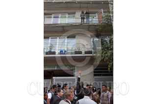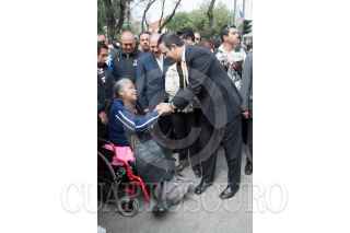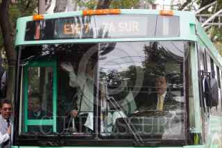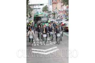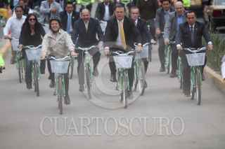 MÉXICO, D.F., 01NOVIEMBRE2012.- El jefe de Gobierno del Distrito Federal, Marcelo Ebrard, encabezó la puesta en marcha del corredor cero emisiones Bus-Bici, en la colonia del Valle, que correrá a lo largo del Eje 7 sur. El corredor cero emisiones Bus-Bici congregará los servicios del transporte eléctrico de la Ciudad de México y a los usuarios de bicicletas en 5 kilómetros de ciclovías y 12 de trolebuses. Al finalizar el evento unas vecinas desde el balcón de su casa le pidieron a jefe capitalino que no permitiera la puesta de ambulantes cerca de las estaciones del metro de la recién inaugurada Línea 12. FOTO: MOISÉS PABLO /CUARTOSCURO.COM