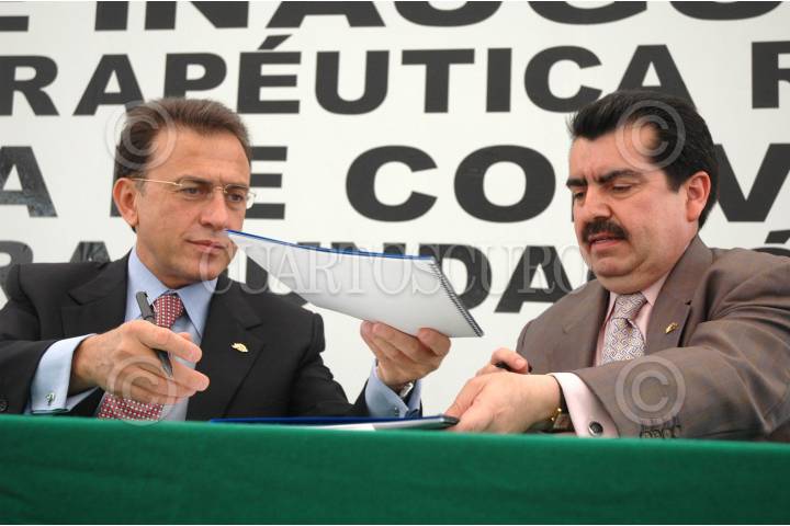 MEXICO, D.F. 26MAYO2005.- Ramón Martín Huerta, Secretario de Seguridad Pública Federal, Y Héctor Slim Seade en la firma de convenio entre Fundación Telmex y la Secretaría de Seguridad Pública Federal. FOTO: Iván Stephens/CUARTOSCURO.COM