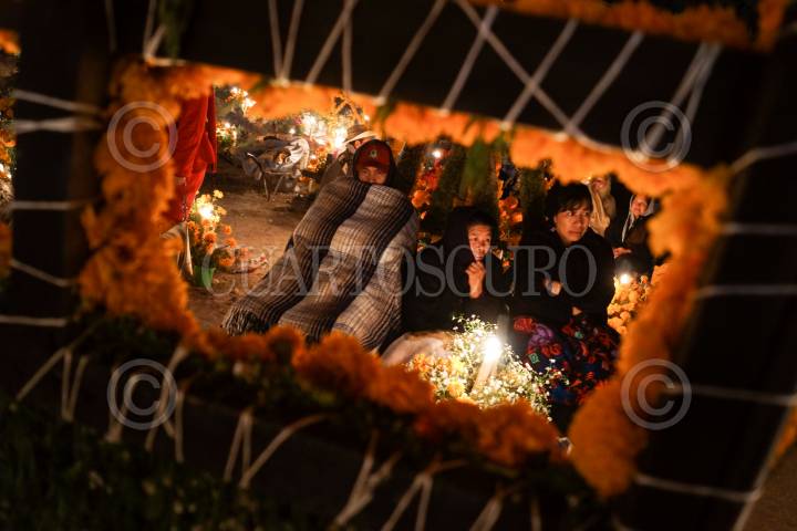 ERONGARÍCUARO, MICHOACÁN, 02NOVIEMBRE2012.- En el panteón de la comunidad de Santa María Trinidad Arocutin, se realiza el día de los muertos. En el centro del pueblo se encuentra el templo de Nuestra Señora de la Natividad, con la peculiaridad, que dentro del perímetro bardeado, se localiza el panteón, justo enfrente de la iglesia. Con un color totalmente naranja, cubierto de de flores de cempasúchil y velas que cada familia lleva a sus difuntos, los pobladores velan durante toda la noche acompañando a sus ofrendas con música, rezando y algunos más guardan silencio. Este festejo popular se realiza de manera tradicional en los pueblos purépechas a la periferia del municipio de Pátzcuaro y de la isla de Janitzio. FOTO: ADOLFO VLADIMIR /CUARTOSCURO.COM