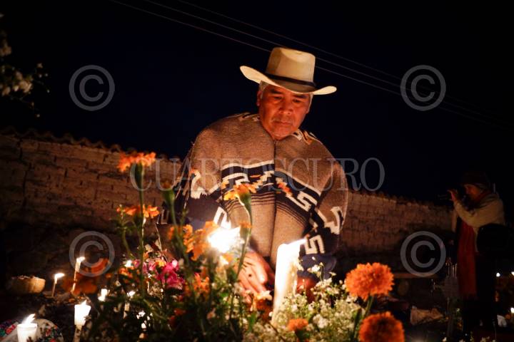 ERONGARÍCUARO, MICHOACÁN, 02NOVIEMBRE2012.- En el panteón de la comunidad de Santa María Trinidad Arocutin, se realiza el día de los muertos. En el centro del pueblo se encuentra el templo de Nuestra Señora de la Natividad, con la peculiaridad, que dentro del perímetro bardeado, se localiza el panteón, justo enfrente de la iglesia. Con un color totalmente naranja, cubierto de de flores de cempasúchil y velas que cada familia lleva a sus difuntos, los pobladores velan durante toda la noche acompañando a sus ofrendas con música, rezando y algunos más guardan silencio. Este festejo popular se realiza de manera tradicional en los pueblos purépechas a la periferia del municipio de Pátzcuaro y de la isla de Janitzio. FOTO: ADOLFO VLADIMIR /CUARTOSCURO.COM