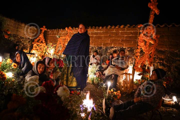 ERONGARÍCUARO, MICHOACÁN, 02NOVIEMBRE2012.- En el panteón de la comunidad de Santa María Trinidad Arocutin, se realiza el día de los muertos. En el centro del pueblo se encuentra el templo de Nuestra Señora de la Natividad, con la peculiaridad, que dentro del perímetro bardeado, se localiza el panteón, justo enfrente de la iglesia. Con un color totalmente naranja, cubierto de de flores de cempasúchil y velas que cada familia lleva a sus difuntos, los pobladores velan durante toda la noche acompañando a sus ofrendas con música, rezando y algunos más guardan silencio. Este festejo popular se realiza de manera tradicional en los pueblos purépechas a la periferia del municipio de Pátzcuaro y de la isla de Janitzio. FOTO: ADOLFO VLADIMIR /CUARTOSCURO.COM
