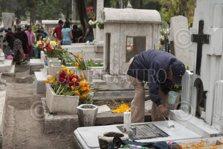 MÉXICO, D.F., 02NOVIEMBRE2012.- El día de hoy miles de capitalinos celebran el día de muertos y acuden a los diversos panteones y mausoleos ubicados en la capital para honrar a sus seres queridos. El panteón de Guadalupe Mixcoac vió el arribo de cientos de personas que repararon, pintaron y colocaron decenas de flores de cempasuchil y nube principalmente, algunos llevaron música, y cocinaron carne asadas para acompañar a los que ya no están entre nosotros. FOTO: FRANCISCO RODRÍGUEZ /CUARTOSCURO.COM