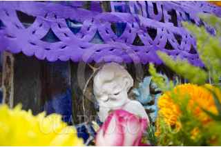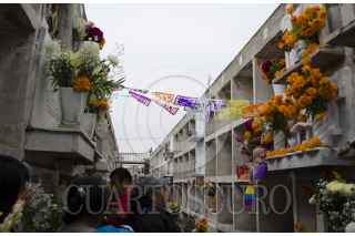 CHIMALHUACAN, ESTADO DE MÉXICO, 02NOVIEMBRE2012.- Con flores, veladoras, papel picado, frutas y en algunos casos música la gente acudió al panteon Los Rosales para acompañar a seres queridos que ya fallecieron y que regresan este día de los muertos, según la tradición popular. Las familias limpian y decoran las tumbas o gavetas para que los difuntos disfruten de los que les gustaba en vida. FOTO: SANDRA PÉREZ /CUARTOSCURO.COM