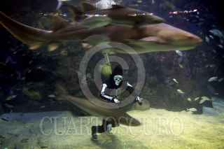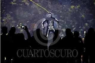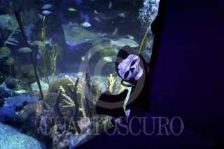 VERACRUZ, VERACRUZ, 02NOVIEMBRE2012.- En el acuario de Veracruz se realizó la inmersión de un buzo disfrazado de calaca en la Gran Pecera Arrecifal, esto como parte de la celebración del Día de Muertos, que sirve como un atractivo más para los visitantes. FOTO: FÉLIX MÁRQUEZ /CUARTOSCURO.COM
