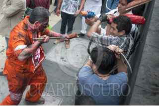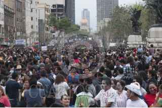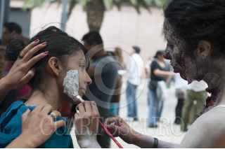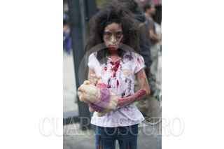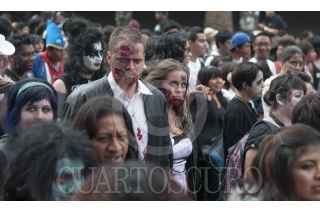MÉXICO, D.F., 03NOVIEMBRE2012.- Miles de personas realizaron la sexta edición de la "Marcha Zombie" 2012 que partió del Monumento a la Revolución hacía el Zócalo capitalino, con una afluencia estimada en más de 20 mil zombies. En el evento también denominado "la marcha de los muertos vivientes" se simularon enfrentamientos de golpes y disparos entre zombies y humanos FOTO: DIEGO SIMÓN SÁNCHEZ /CUARTOSCURO.COM